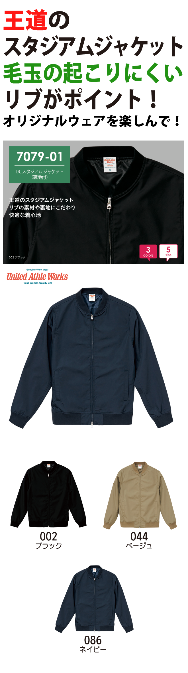 ポリエステルの耐久性と綿の快適性を兼ね備えた型崩れの少ないT/Cウェザーのスタジアムジャケット。