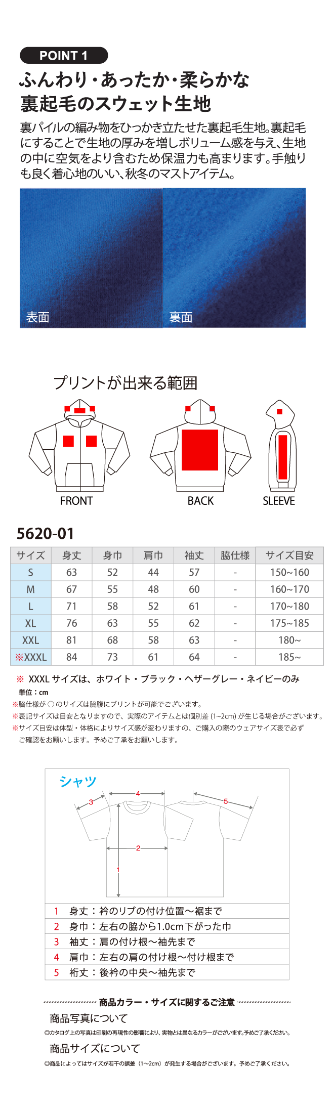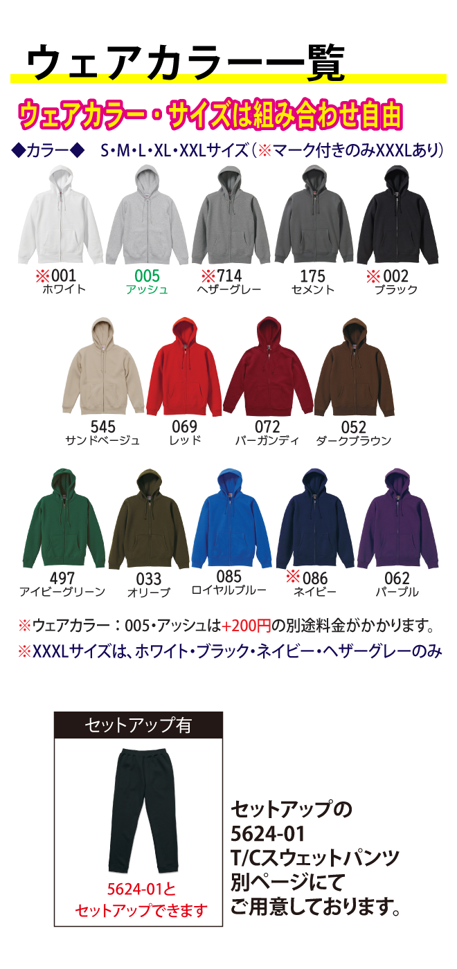 着脱が容易なフルジップタイプは、屋内外のアウターとして重宝!裏地はふかふかで保温性の高い裏起毛にしながら、T/C(綿×ポリエステル)の生地にすることで軽くて丈夫なスウェットに仕上げました。表面を綿100%で組成してあるので、プリント加工にも最適。