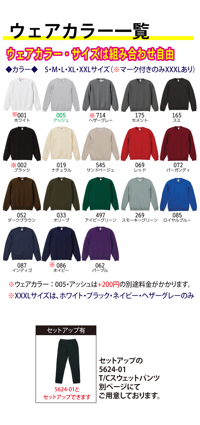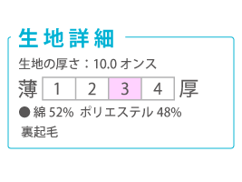 普段使いにもリラックスシーンにも活躍するスタンダードスタイルのクルーネック。T/C生地を使用しているので、裏起毛&10オンスながら軽やかに着ていただくことができます。表地は綿100%で組成しているので毛玉ができにくく、オリジナルプリント加工にも最適です!