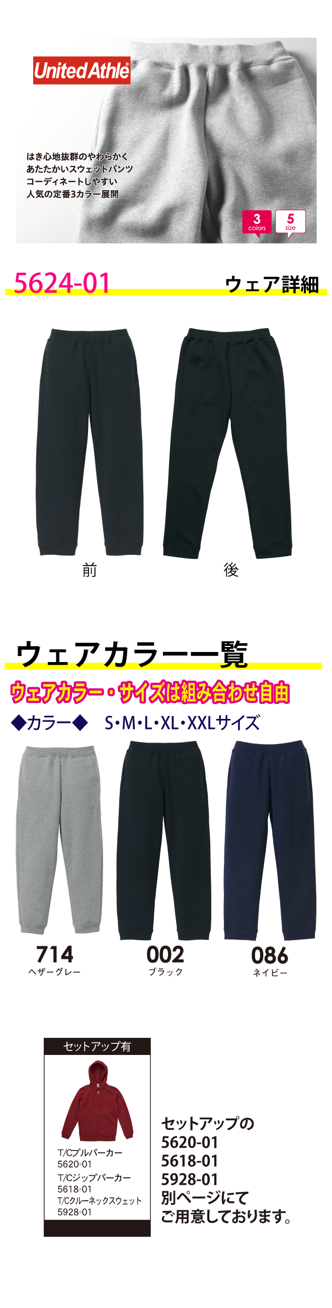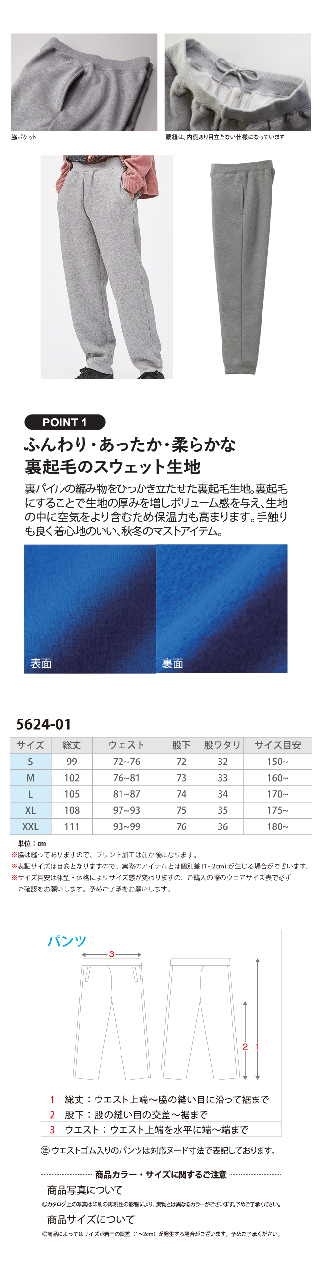 サイドポケットがあり、ウエスト部分は内側の丸ひもによって調整が可能、裾下はリブ仕様になっています。身頃とリブのつなぎ部分はまたぎ2本針ステッチが入っているのでカジュアルな印象。Style No.5620-01・5618-01・5928-01のスウェットトップスと上下セットアップを組むことが可能です。表糸は綿100%で毛玉ができにくいので、プリント加工に向いているのもポイント。