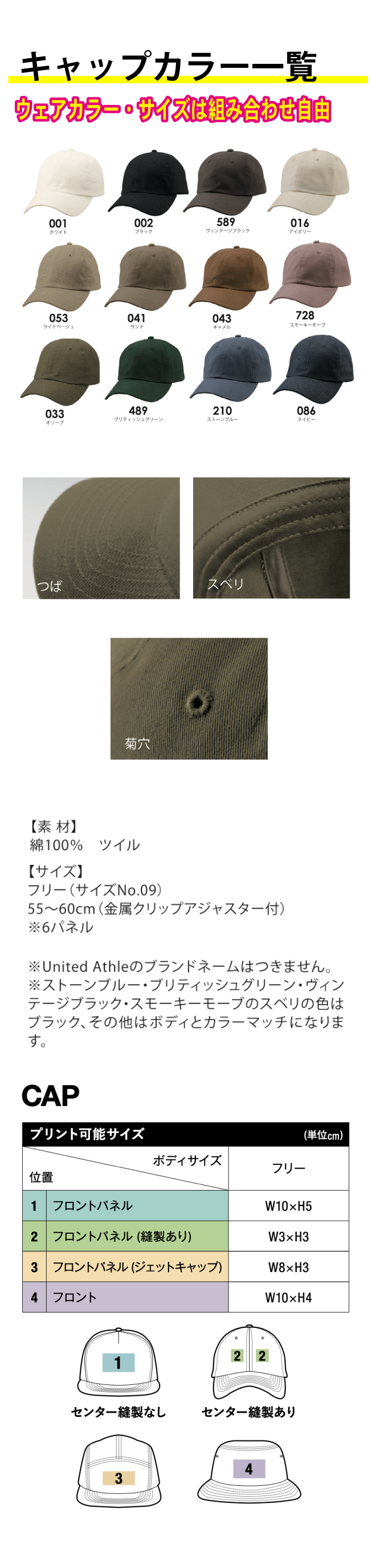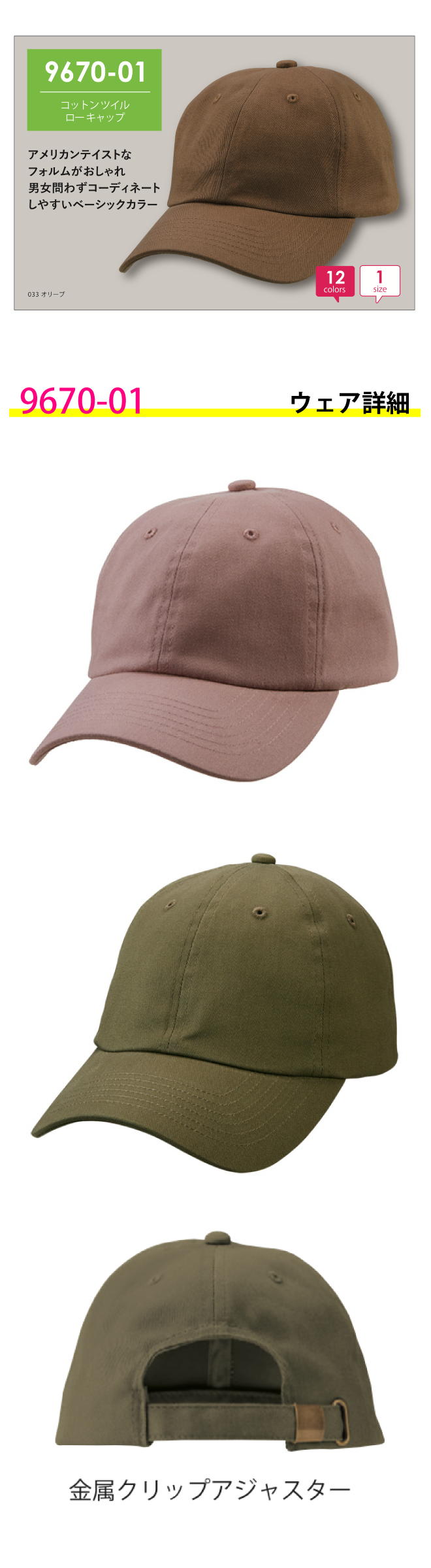 金属クリップアジャスター付きでサイズ調整ができ、ベーシックカラーを取り揃えているのでコーディネートに合わせやすく、男女問わず人気の定番キャップです。