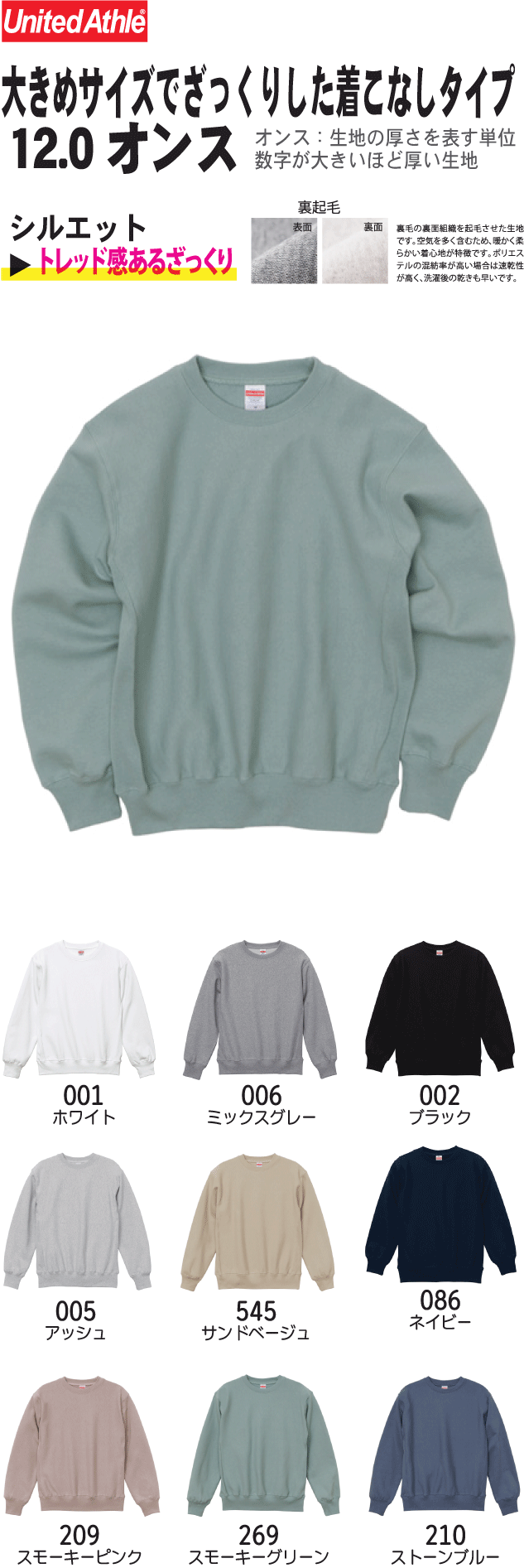 表面はオープンエンド糸特有のザラ感のあるざっくりした風合い、乾いた硬い肌ざわりの厚手生地が特徴。生地目を横取りしサイドパネルのリブ仕様となっているため、型崩れしにくく、洗うほどにタフになり、着こむほどに独特の風合いとエイジングが楽しめます。ゆったりとしたヴィンテージライクなシルエットで着用時の袖の絶妙なルーズさもポイント。大きめサイズでざっくりした着こなしが楽しめます。