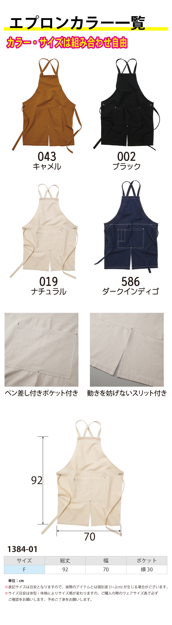 フロントスリットを配置することにより引っかかりを軽減。しゃがみやすいため、キッチンからガーデニングと幅広いワークウェアとしても利用可能。ペン差し付きの大振りのポケット付きのため実用性も抜群。また、マットシルバーのリベットやアイレットのギミックが頑丈さとオーセンティックさを表現しています。