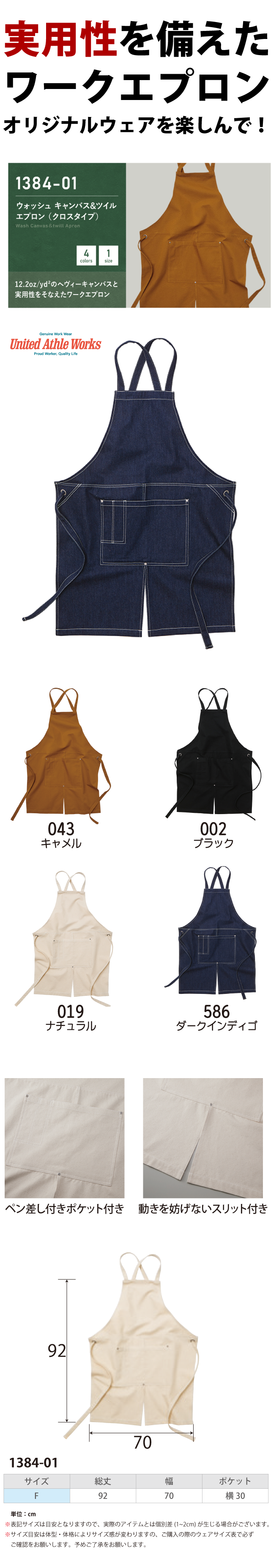 フロントスリットを配置することにより引っかかりを軽減。しゃがみやすいため、キッチンからガーデニングと幅広いワークウェアとしても利用可能。ペン差し付きの大振りのポケット付きのため実用性も抜群。また、マットシルバーのリベットやアイレットのギミックが頑丈さとオーセンティックさを表現しています。