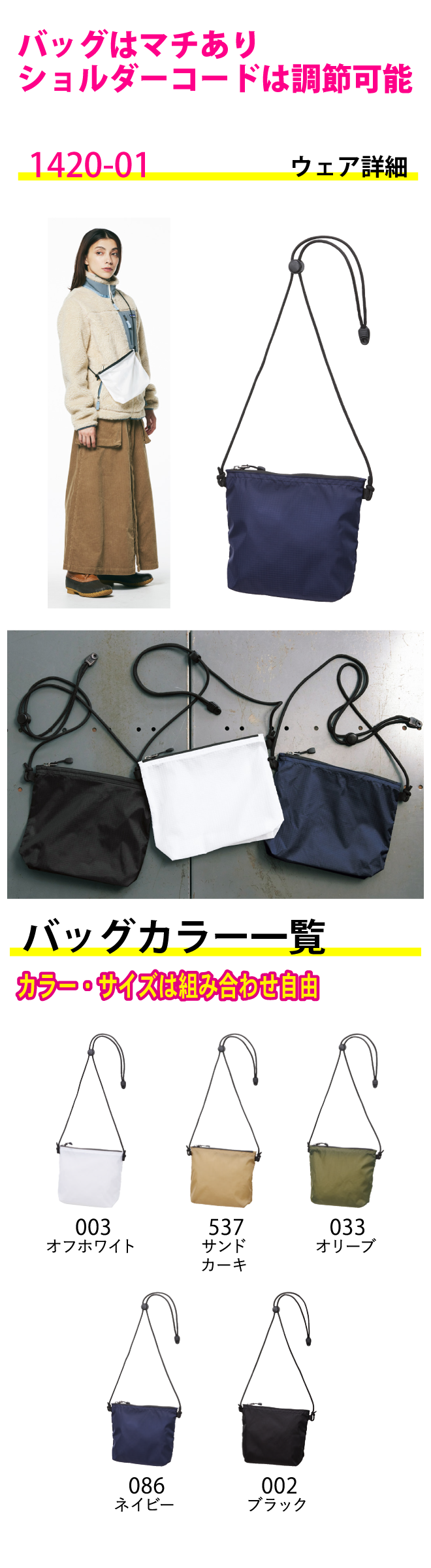 ちょっとしたお出かけや、肌身離さず持っていたいアイテムの持ち運びに重宝するナイロン製サコッシュ。旬のサイズ感ながらマチがあるため、財布やスマホ、パスケースなども収納可能なほか、吊りポケットも配しているため日常づかいにとても便利。パラシュートなどにも使われる「リップストップ生地」は軽くて裂けにくいだけでなく、格子模様とほどよい光沢感が、ワンマイルコーデのアクセントとなることうけあいです。ストラップにはアクセントとなる円筒型のアジャスターが付属、ワンタッチでサイズ調節をすることができます。ミリタリーやアウトドアのテイストを踏襲したカラーリングと細やかな意匠が光る「ひとつ持ってて損はないアイテム」。
