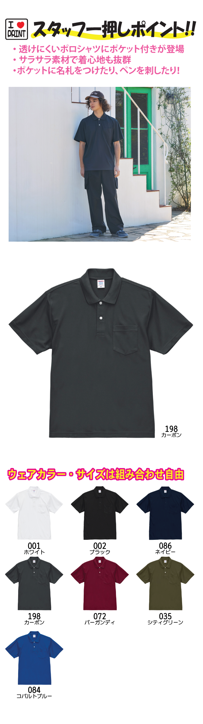 快適な着心地が人気の「スペシャル ドライ カノコ シリーズ 」にポケット付きポロシャツが仲間入り!名札を付けたり、ペンを差したりできるポケ付きタイプはビジネスユースにも人気のため、デイリーユースできるよう、鹿の子編み×ポリエステル100%の生地を採用。繰り返し洗っても色落ちしにくく、毛羽や毛玉が気になりにくい生地は、日々のお手入れが簡単です。また、ホワイトの生地には透け感を軽減させる特殊な糸を使用しているため、インナーが透けにくいのも魅力。上品で光沢感あるポケット付きポロシャツは、仕事でも休日でも「これ一枚でキマる」万能プロダクトです。