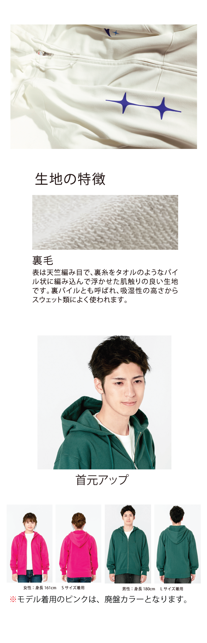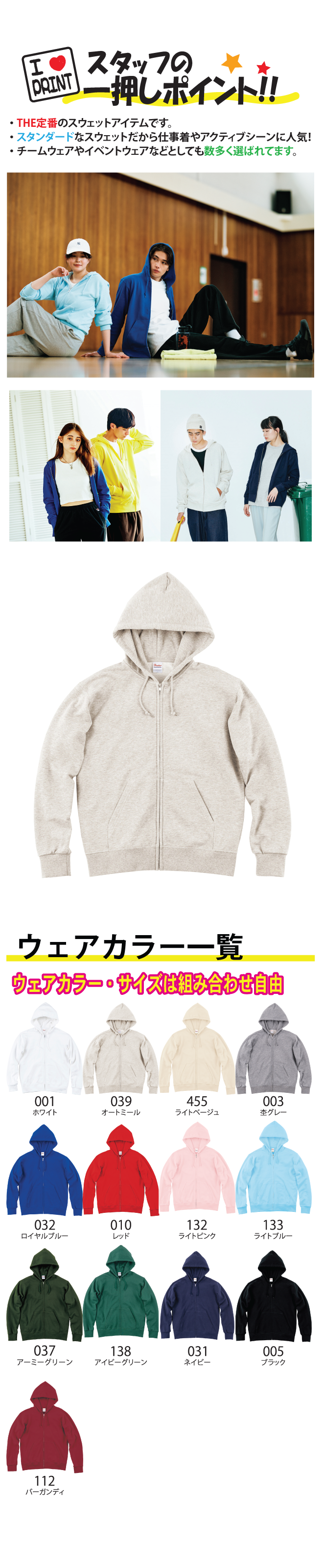 生地は中厚タイプで袖口がリブ仕様でダンス・チームウェアとしても人気のジップパーカーです。